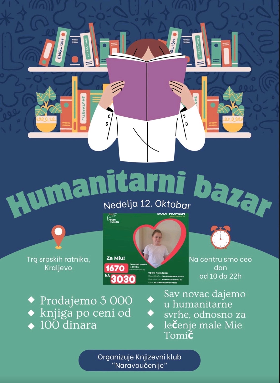 Na Trgu srpskih ratnika u nedelju, 12. oktobra Književni klub “Naravoučenije” organizuje humanitarni bazar za Mi Tomić, devojčicu koja je otopila mnoga srca i postala heroina u svojoj borbi za ozdravljenje.